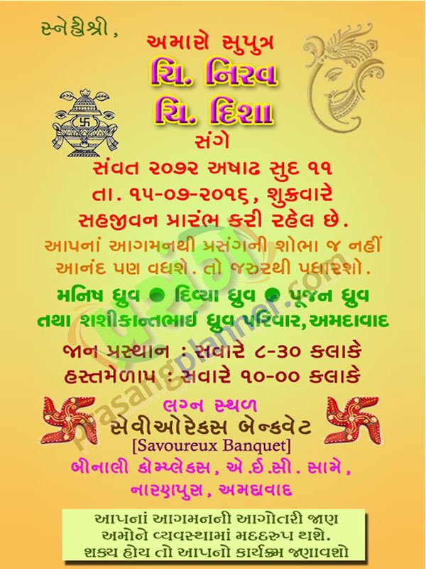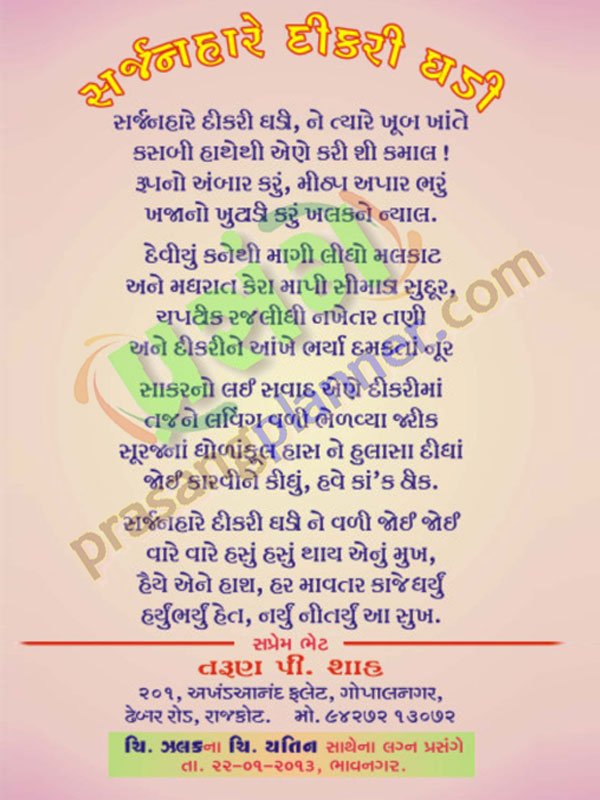અહિયાં આ ડાઉનલોડ વિભાગમાં આપને વિવિધ પ્રકારની અનેક ઉપયોગી સામગ્રી જેવી કે કંકોતરી તૈયાર કરવા માટેનાં જુદા જુદા લખાણ, કંકોતરીનાં સેમ્પલ્સ, પ્રસંગોને અનુરૂપ આમંત્રણ કાર્ડનાં સેમ્પલ્સ, પ્રસંગોચિત શુભેચ્છા પત્ર વિગેરે મળશે.